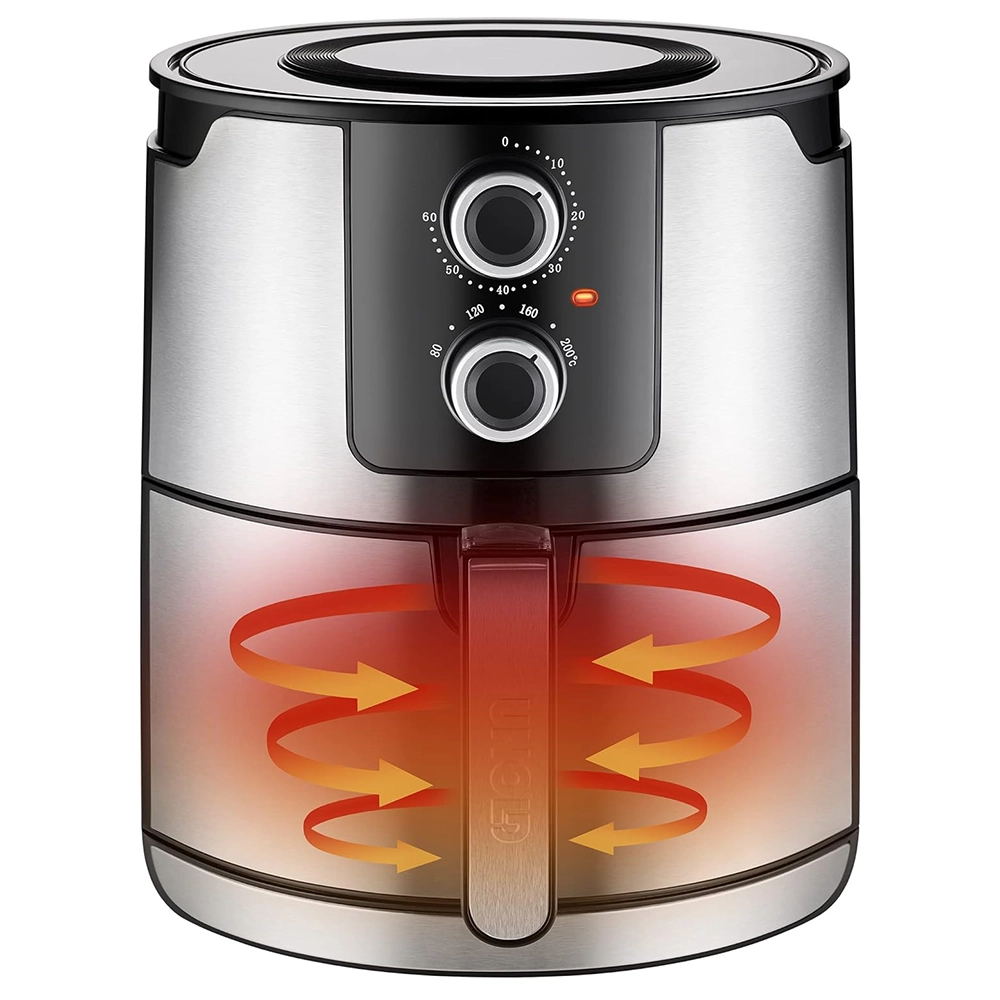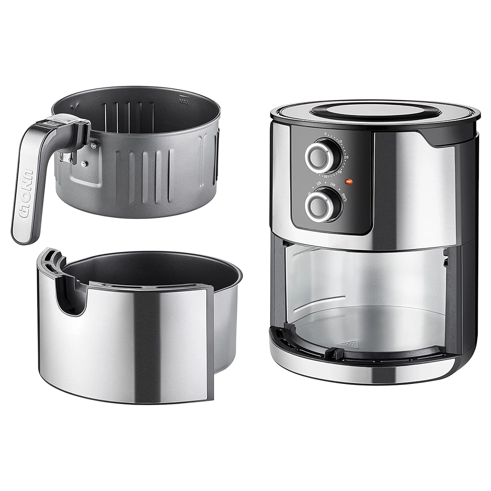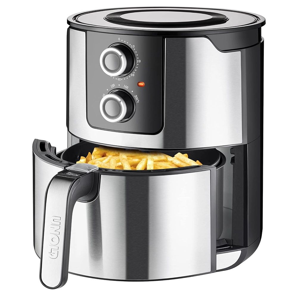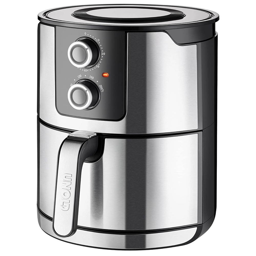 Frytkownica Unold to smażenie, grillowanie, gotowanie, suszenie, pieczenie, utrzymywanie ciepła, podgrzewanie, rozmrażanie i prażenie – potrafi wszystko! Można przy tym całkowicie zrezygnować z oleju. Dzięki cyrkulacji gorącego powietrza o temperaturze 200°C zapewnione jest szybkie i energooszczędne przygotowanie potraw. Bezstopniowo reguluj temperaturę od 80 do 200°C – za pomocą łatwego w obsłudze pokrętła. Dzięki 60-minutowemu timerowi zarządzanie gotowaniem jest dziecinnie proste.