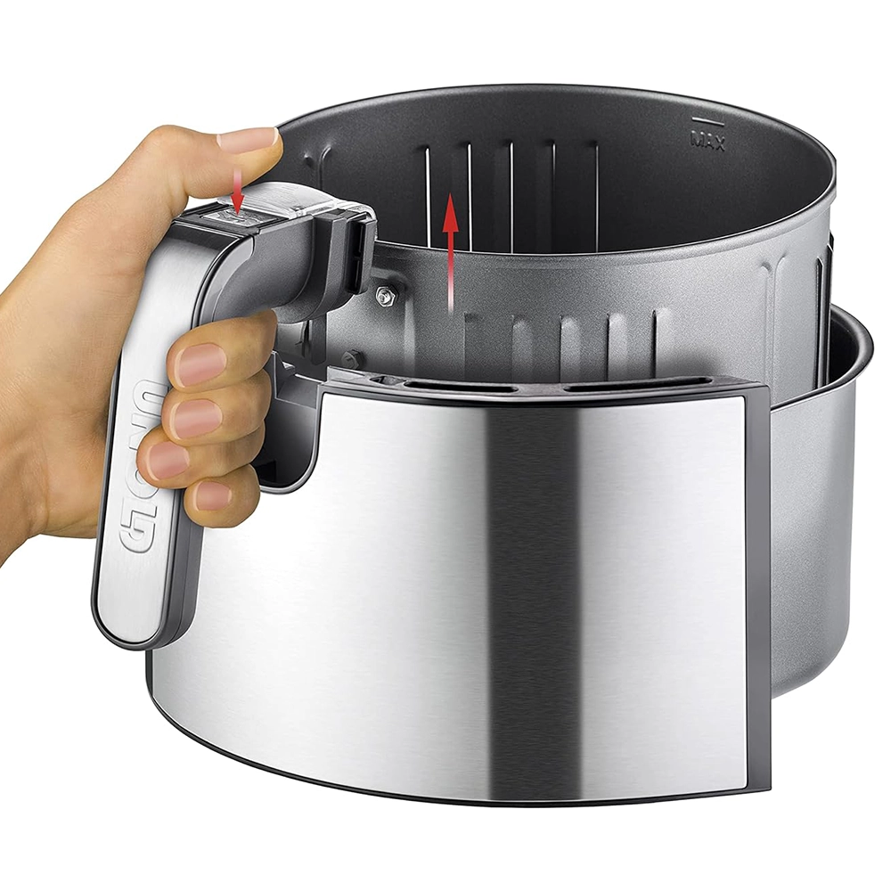 Pojemnik do smażenia wyróżnia się pojemnością 5l – dzięki temu można na przykład przygotować 1 kg frytek w jednym cyklu pracy. Dzięki wysokiej jakości powłoce zapobiegającej przywieraniu czyszczenie nie stanowi problemu. Ponadto kosz nadaje się do mycia w zmywarce. Lampka kontrolna pracy sygnalizuje, gdy urządzenie o mocy 1400W działa.
